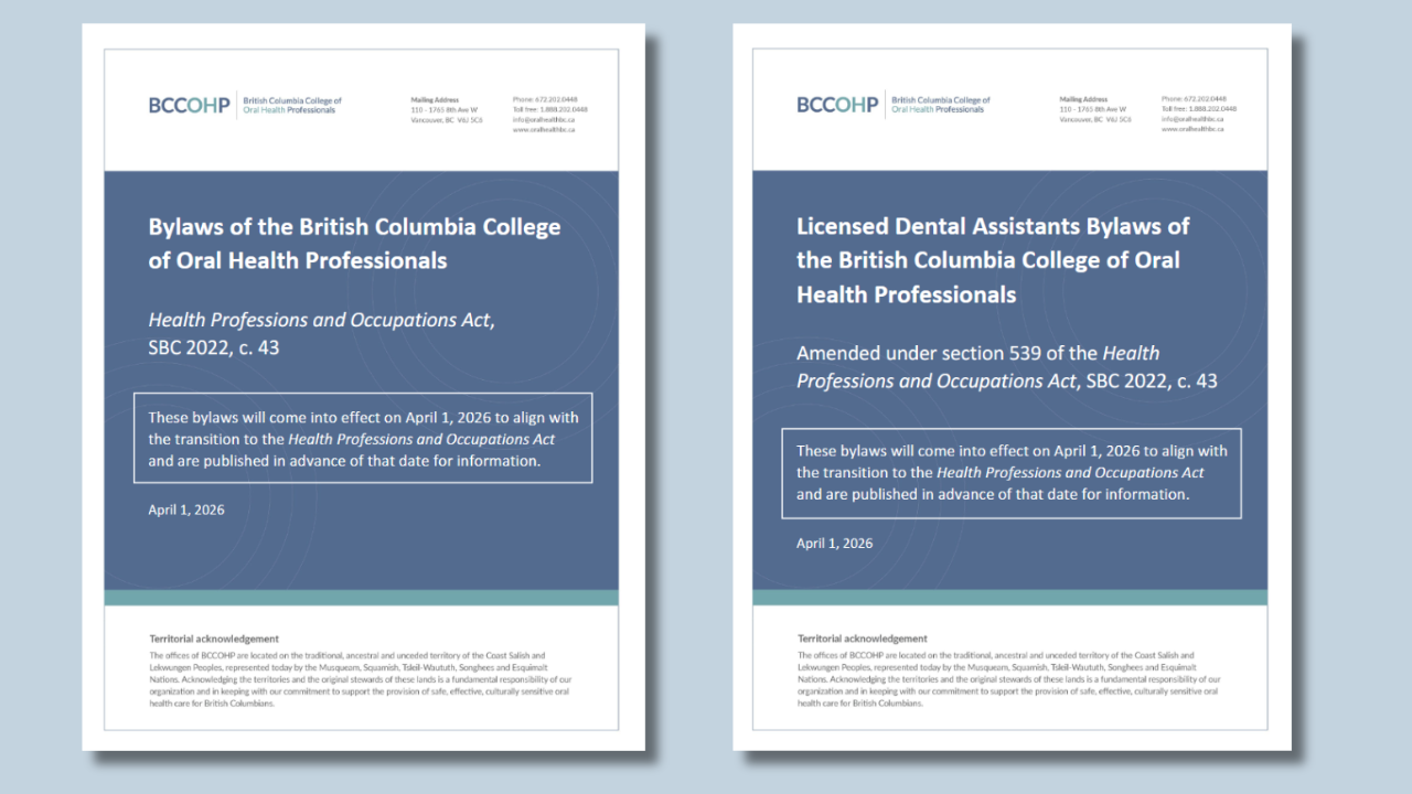 Today marks the transition to the Health Professions and Occupations Act (HPOA). BCCOHP has been preparing to regulate under the new Act for some time and anticipates that oral health professionals will not see significant impacts on their daily practice. We will continue to roll out information as we begin operating under the new Act, but here’s what you need to know today: